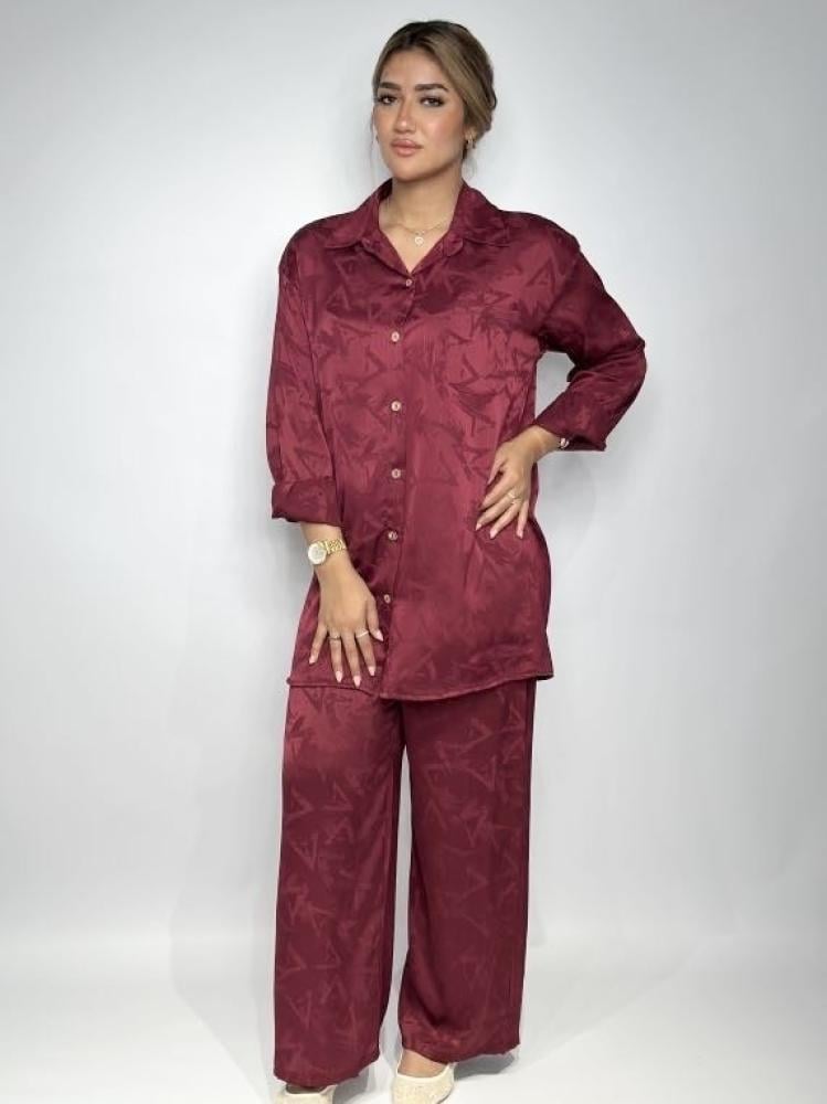 يتميز القماش بنقشات ناعمة تضيف لمسة ترف راقية، وقصّة مريحة تجعل الطقم مثاليًا للسفر والجمعات والإطلالات اليومية الأنيقة.